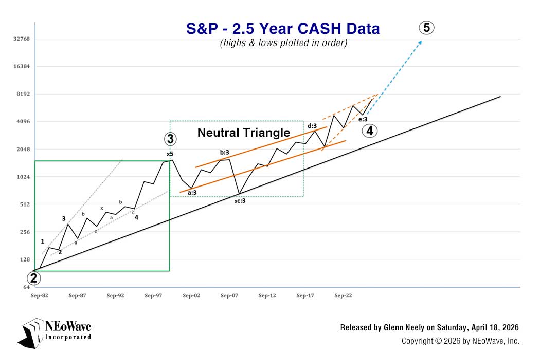 Following the peak in 2000, the market has been in wave-4, forming a NEoWave neutral Triangle1 over more than two decades.